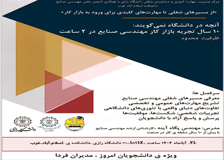 مرکز مدیریت مهارت آموزی و مشاوره ی شغلی دانشگاه رازی با همکاری انجمن علمی مهندسی دانشکده اسلام آبادغرب برگزار می کند:
